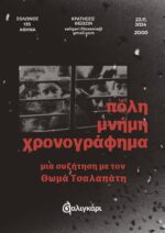 Με πολλή χαρά σάς προσκαλούμε στην πρώτη εκδήλωση της χρονιάς, με προσκεκλημένο τον ποιητή και θεατρικό συγγραφέα Θωμά Τσαλαπάτη. Άξονες της συζήτησής μας θα αποτελέσουν οι έννοιες της μνήμης και της πόλης όπως αποτυπώνονται στο είδος του χρονογραφήματος.
